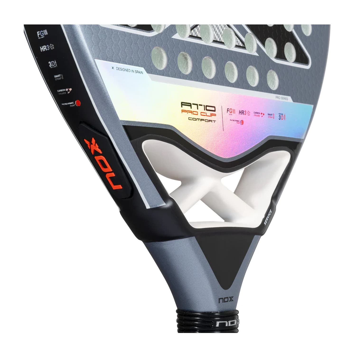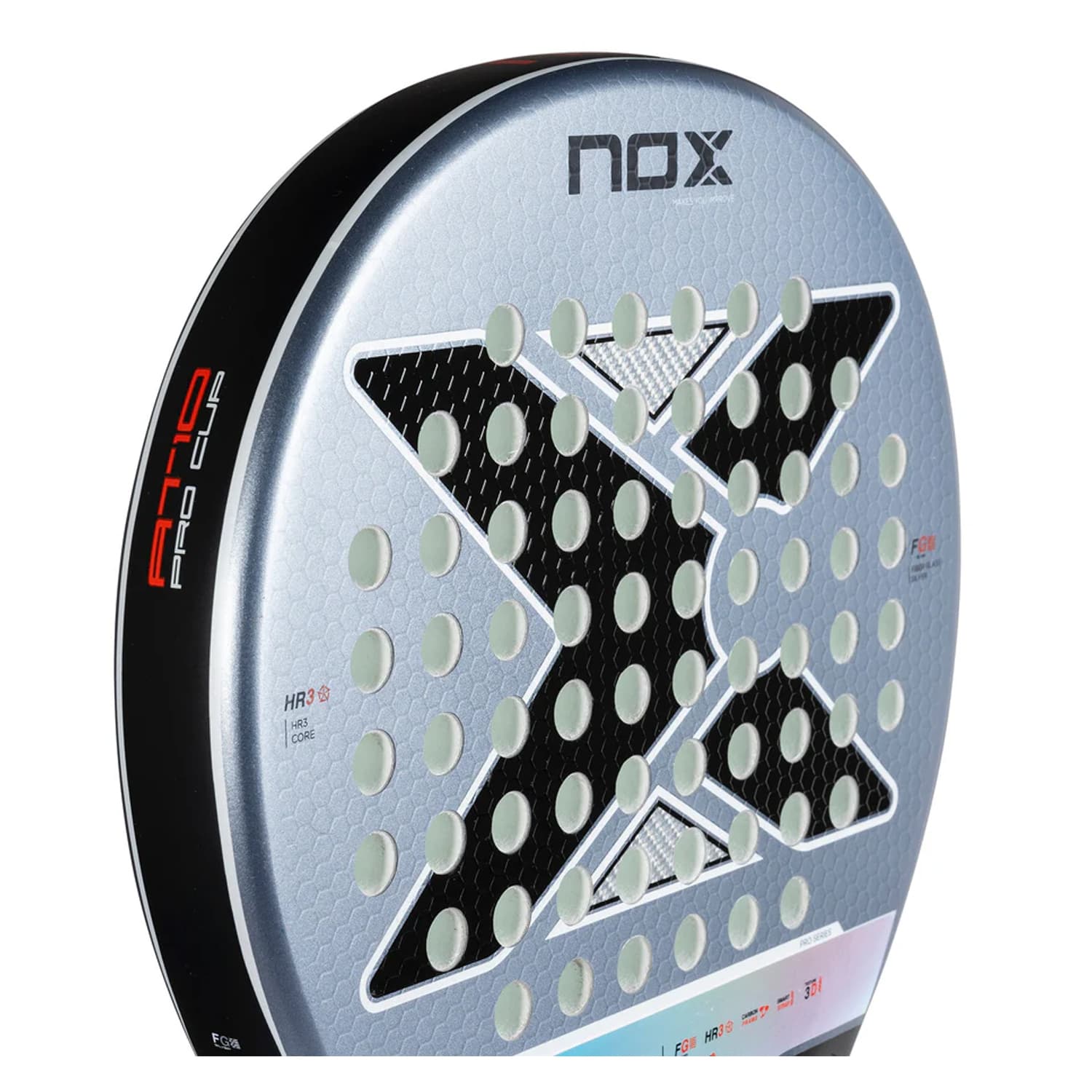 The NOX AT10 Pro Cup Comfort Padel Racquet merges the classic AT10 design with advanced materials and Photochromic Paint. With a fiberglass metallic finish and HR3 core, it provides excellent control and comfort, making it ideal for intermediate players.